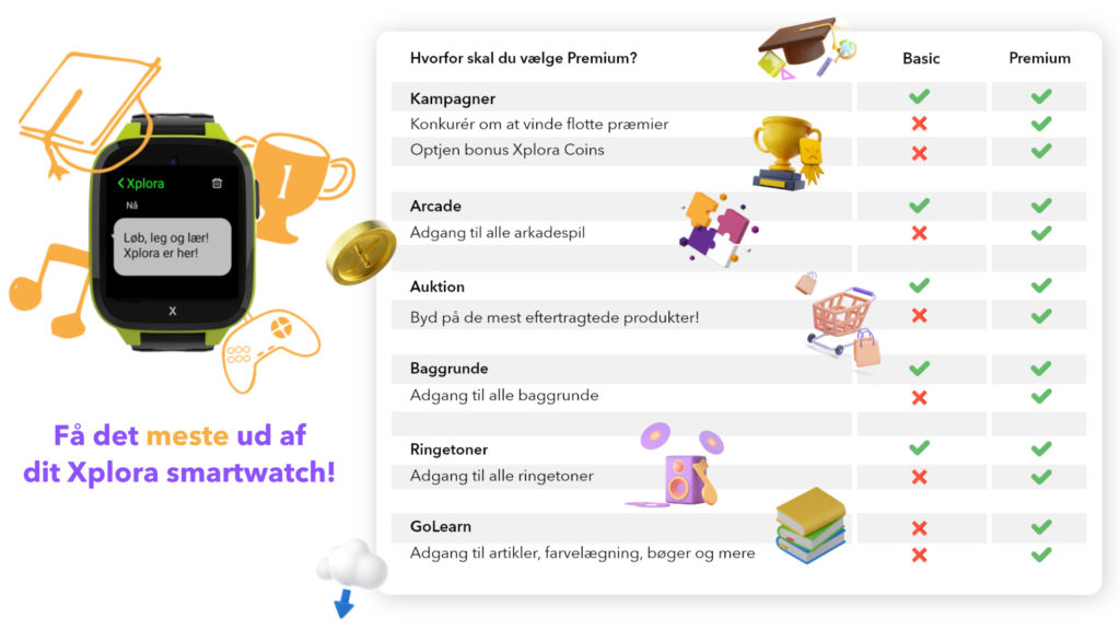 En basisversion af platformen er inkluderet i alle Xploras smartwatches til børn. I Basic får du adgang til et par udvalgte ringetoner og baggrunde (kun til X6Play) samt et par udvalgte arkadespil og auktioner. Alle kampagner er også inkluderet i basisversionen, men ønsker du at optjene bonus XCoins og chancen for at vinde præmier, skal du se over mod Premium.